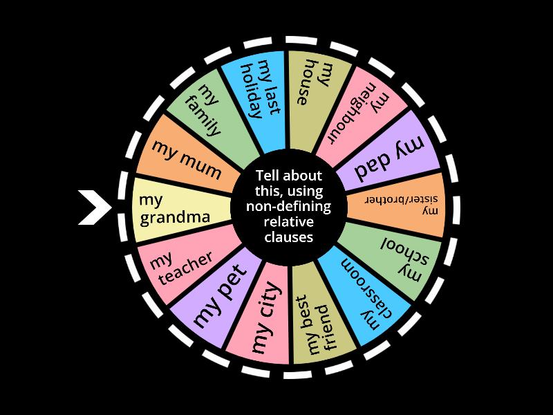 1) my mum 2) my family 3) my last holiday 4) my house 5) my neighbour 6) my dad 7) my sister/brother 8) my school 9) my classroom 10) my best friend 11) my city 12) my pet 13) my teacher 14) my grandma
