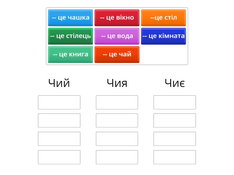Чий: --це стіл, -- це чай, -- це стілець, Чия : -- це книга, -- це чашка, -- це вода, -- це кімната, Чиє: -- це вікно,