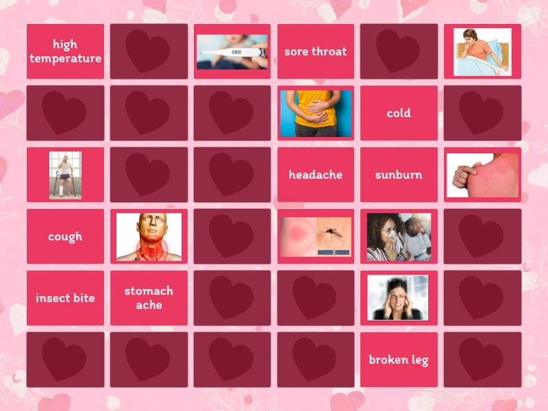 broken leg, insect bite, cough , headache, stomach ache , sore throat, cold, sunburn, high temperature, cut, aspirin, cough medicine, plasters, antiseptic cream, suncream, bandage, First aid , Health problems ,