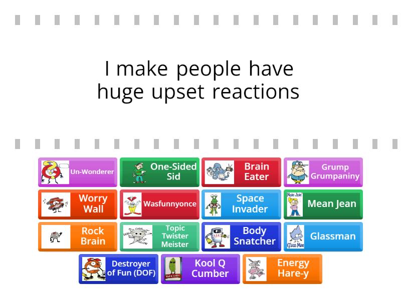 Glassman - I make people have huge upset reactions, Brain Eater - I distract people, Rock Brain - I make people get stuck on their ideas, One-Sided Sid - I get people to only talk about themselves, Un-Wonderer - I don't like people to socially wonder about others, Body Snatcher - I move people's bodies from the group, Topic Twister Meister - I make people jump off topic, Worry Wall - I make people worry too much, Kool Q Cumber - I help citizens learn to keep their cool (be calm) when problems occur, Space Invader - I get people to invade others' personal space, Wasfunnyonce - I get people to use humor at the wrong time, the wrong place or with the wrong person, Energy Hare-y - I give people too much energy, Mean Jean - I get people to act mean and bossy, Grump Grumpaniny  - I put people in grumpy moods, Destroyer of Fun (DOF) - I make people overly competetive,