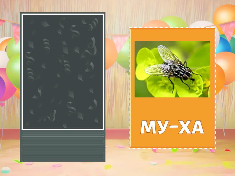 ВО-ДА, МУ-ХА, РУ-КА, КЕ-ДИ, ДИ-НЯ, ВА-ТА, ЛА-ПА, СО-ВА, КО-ЛЯ, ДА-ША, ВУ-СА, МА-ША, МІ-ША, О-СА, КИ-ЦЯ, ПІ-НА, МИ-ЛО.