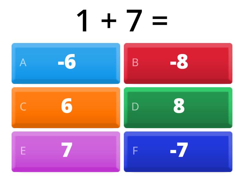 1) 1 + 7 =  a) -6 b) -8 c) 6 d) 8 e) 7 f) -7 2) 8 + 2 = a) -10 b) 6 c) 10 d) -6 e) -16 f) 16 3) -6 + 2 = a) -8 b) -4 c) 8 d) 4 e) -12 f) 12 4) 5 + (-8) = a) 13 b) -3 c) -13 d) 3 e) 40 f) -40 5) -1 + 4 = a) 3 b) -3 c) -5 d) 5 e) 4 f) -4 6) -4 + 4 = a) 0 b) 8 c) -8 d) 16 e) -16 f) -1 7) 2 + (-9) = a) -7 b) 7 c) 11 d) -11 e) -18 f) 18 8) -6 + 5 = a) -1 b) 1 c) -11 d) 11 e) -30 f) 30