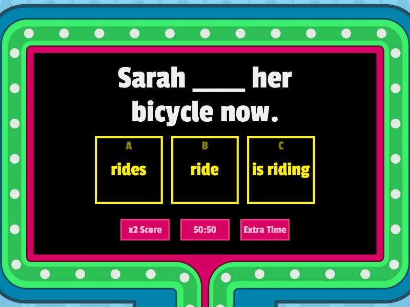 1) Sarah ____ her bicycle now. a) rides b) ride c) is riding 2) Frank and John ____ to the train station every morning. a) walk b) walks c) are walking d) walking 3) Usually, I ___ my homework in the afternoon. a) doing b) do c) am doing 4) Julia ____ a book at the moment. a) is reading b) reads c) read 5) Every Tuesday I ____ French lessons a) had b) am having c) have 6) This weekend I ____ at the hotel with my grandparents a) stay b) am staying c) stays 7) Sometimes we ____ to the gym a) go b) gos c) are going 8) Listen to what your teacher ____ ! a) is saying b) say c) sayed