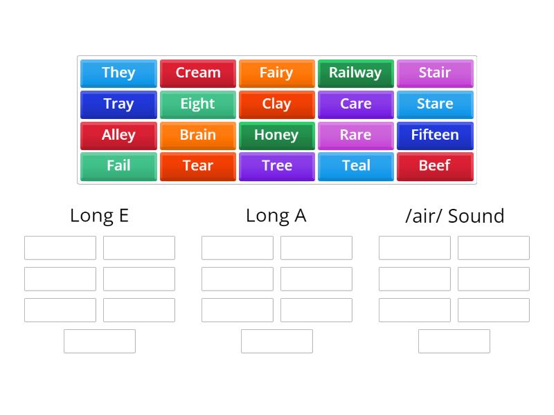 Long E: Tree, Beef, Cream, Alley, Honey, Teal, Fifteen, Long A: They, Fail, Eight, Brain, Tray, Clay, Railway, /air/ Sound: Tear, Stair, Rare, Stare, Fairy, Care,