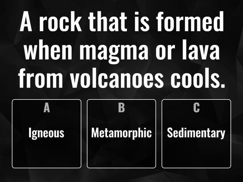 1) A rock that is formed when magma or lava from volcanoes cools. a) Igneous b) Metamorphic c) Sedimentary 2) A rock that is formed over millions of years when sediments (tiny pieces of rocks and animal skeletons) are pressed together at the bottom of seas and rivers. a) Igneous b) Metamorphic c) Sedimentary 3) A rock that is formed when other rocks are changed due to heat or pressure. a) Igneous b) Metamorphic c) Sedimentary 4) Examples: slate and marble a) Igneous b) Metamorphic c) Sedimentary 5) Examples: sandstone and coal a) Igneous b) Metamorphic c) Sedimentary 6) Examples: basalt and granite a) Igneous b) Metamorphic c) Sedimentary 7) What type of rock is this? a) Igneous b) Metamorphic c) Sedimentary 8) What type of rock is this? a) Igneous b) Metamorphic c) Sedimentary 9) What type of rock is this? a) Igneous b) Metamorphic c) Sedimentary 10) Igneous rocks with large crystals form due to... a) magma cooling slowly inside the Earth b) magma cooling fast inside the Earth c) lava cooling slowly on the Earth d) lava cooling fast on the Earth
