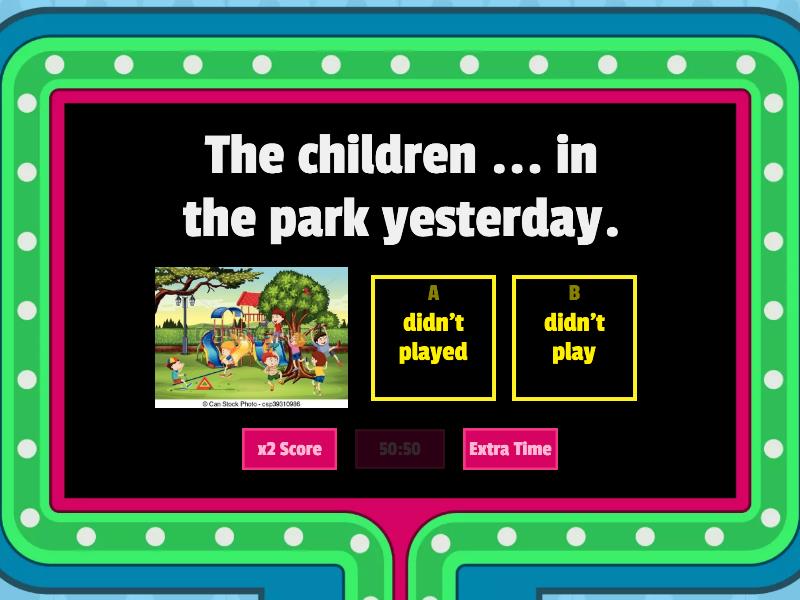 1) The children ... in the park yesterday. a) didn't played b) didn't play 2) My mother ... soup yesterday.  a) didn't cooked b) didn't cook 3) She ... to music last week. a) didn't listen b) didn't listened 4) Jim ... football 2 days ago. a) didn't played b) didn't play 5) I ..... to buy some ice cream. a) didn't wanted b) didn't want 6) She ..... French at school. a) didn't study b) didn't studied 7) Paula ...... school in 1992 a) didn't finished b) didn't finish 8) Dorothy __________________in the Land of Oz. a) didn't see b) didn't live c) didn't run 9) Dorothy ________________a Scarecrow in yellow clothes. a) didn't see b) didn't visit c) didn't find 10) The Scarecrow couldn't help because he __________brains. a) didn't see b) didn't find c) didn't have