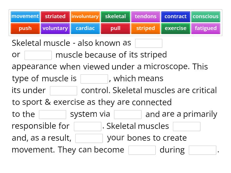 Skeletal muscle - also known as ____ or ____ muscle because of its striped appearance when viewed under a microscope. This type of muscle is ____, which means its under ____ control. Skeletal muscles are critical to sport & exercise as they are connected to the ____ system via ____ and are a primarily responsible for ____. Skeletal muscles ____ and, as a result, ____ your bones to create movement. They can become ____ during ____.