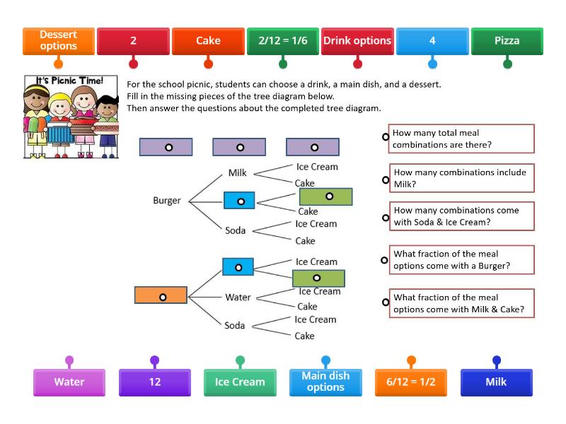 Main dish options, Drink options, Dessert options, Pizza, Water, Milk, Ice Cream, Cake, 12, 4, 2, 6/12 = 1/2, 2/12 = 1/6.