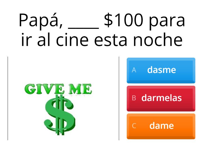 1) Carlos, ¡____ la tarea ahora! a) haces b) Haz c) Hagas d) Hice e) hacer 2) Carmen, ¡____ la verdad, por favor! a) di b) dice c) digas 3) ____en cuenta que es necesario dormir 8 horas. a) Tienes b) Ten c) Tengas 4) Papá, ____ $100 para ir al cine esta noche a) dasme b) darmelas c) dame 5) ____ a Papi's a comprarme unos patacones, por favor. a) Ve b) Va c) Vayas 6) Ortegon, no me ____ una torta de piña sino una de chocolate. a) haces b) hago c) hagas d) haz 7) Thomas, ____ un buen chico, vale? a) sea b) sé c) eres 8) No ____ la mesa ahora, ponla como a las 8 de noche. a) pones b) pone c) pongas d) pon 9) ¡ ____ de la escuela temprano el viernes, por favor! a) Salgas b) Sal  c) Sales 10) ____ a mi casa a las 6 de tarde a jugar Smash Brothers con mi hermana y conmigo.  a) Vienes b) Vengas c) Ven 11) No ____ tarde del trabajo. a) sales b) sal c) salgas d) salir e) salgo 12) ¡No ____ tonto! no juegues con agua! a) ser b) seas c) soy d) eres e) es