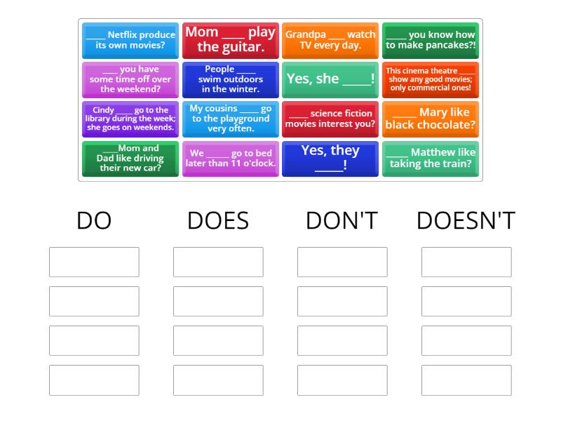 DO: ____ you have some time off over the weekend?, Yes, they _____!, ____Mom and Dad like driving their new car?, _____ science fiction movies interest you? , DOES: _____ Mary like black chocolate?, Yes, she _____!, _____ Matthew like taking the train?, _____ Netflix produce its own movies?, DON'T: People _____ swim outdoors in the winter., We ______ go to bed later than 11 o'clock., My cousins _____ go to the playground very often., _____ you know how to make pancakes?! , DOESN'T: Mom ____ play the guitar., Grandpa ____ watch TV every day., This cinema theatre _____ show any good movies; only commercial ones!, Cindy _____ go to the library during the week; she goes on weekends.,