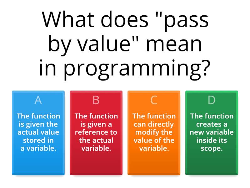 1) What does "pass by value" mean in programming? a) The function is given the actual value stored in a variable. b) The function is given a reference to the actual variable. c) The function can directly modify the value of the variable. d) The function creates a new variable inside its scope. 2) In "pass by reference," a function receives: a) A new copy of the variable. b) The memory address of the variable. c) A constant value. d) An encrypted version of the variable. 3) Which of the following is true about "pass by value"? a) It allows the function to modify the original variable. b) It is more memory efficient when dealing with large objects. c) It ensures that the original variable remains unchanged. d) It is the default method in JavaScript for all types of variables. 4) In which scenario might "pass by reference" be more efficient than "pass by value"? a) When the function needs to modify an input variable. b) When dealing with small, simple variables. c) When maximum security and data protection is required. d) When the programming language does not support pointers or references. 5) Which of the following programming languages uses "pass by value" for primitive types by default? a) Python b) C++ c) JavaScript d) All of the above