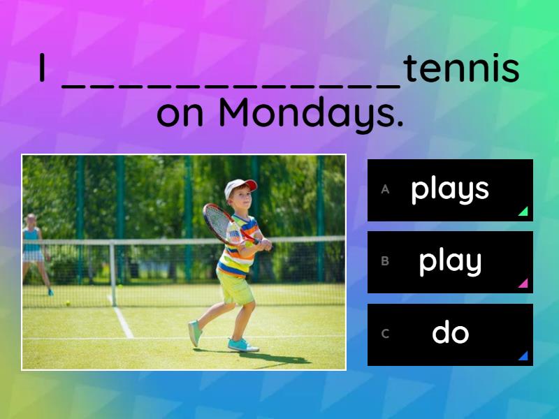 1) I ____________tennis on Mondays.  a) play b) plays c) do 2) I _____________tennis on Thursdays.  a) don't play b) not play c) doesn't play 3) You__________pizza.  a) likes b) doesn't like c) like 4) You__________pizza.  a) doesn't like b) don't like c) not like 5) She ____________very well. a) dances b) dance c) read 6) He____________English after school.   a) study b) studies c) studys 7) He___________Spanish after school.   a) doesn't study b) doesn't studies c) not studies 8) My computer is new. It ___________very well. a) go b) work c) works 9) We____________to the cinema every Saturday. a) goes b) do c) go 10) We___________to the cinema every Wednesday. a) doesn't go b) don't go c) not go 11) You ___________a big house.  a) has b) have c) live 12) They __________ their grandparents at weekends.  a) visit b) visits c) visiting 13) They _________ their grandparents at weekends.  a) not visit b) don't visit c) visits 14) My father _______________ TV at night.  a) watch b) watches c) watchs 15) My mother _____________ in a hospital.  a) working b) work c) works 16) My mother ____________ at school.  a) don't work b) doesn't work c) doesn't works 17) It ____________ a lot in autumn.  a) rains b) rain c) snow 18) Tom and Carla ____________ fruit every morning.  a) eat b) eats c) cooks 19) Peter and I ______________ the dishes after dinner.  a) washes b) wash c) read 20) The dog ______________ very fast.  a) run b) runs c) runns