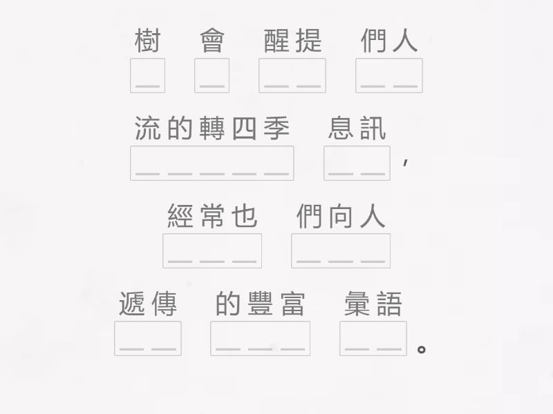 樹 會 提醒 人們 四季流轉的 訊息, 也經常 向人們 傳遞 豐富的 語彙。, 作者 煩心時 會走進樹林, 看著 陽光篩落的 影子, 聽聽 風聲和樹的對話。, 春天 是 紫色羊蹄甲花 盛開的季節; 火紅的鳳凰花 燦爛在夏天; , 當臺灣欒樹 長出蒴果, 代表秋天到了; 印度紫檀落葉時 已經是冷冽的冬季, 北風瑟瑟的時候。, 只要 能 用心靈 和樹交朋友, 人們 就會 聽見樹的傾訴, 聞見芬芳的氣息。,