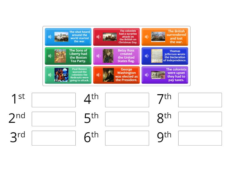 The colonists were upset they had to pay taxes., The Sons of Liberty had the Boston Tea Party., Paul Revere warned the colonists the Redcoats were going to attack., The shot heard around the world started the war., Thomas Jefferson wrote the Declaration of Independence., Betsy Ross created the United States flag., The colonists had a surprise attack on the British on Christmas Day., The British surrendered and lost the war., George Washington was elected as the President..
