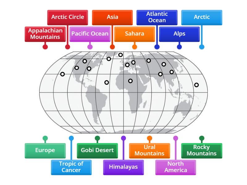 Arctic, Arctic Circle, Ural Mountains, Rocky Mountains, North America, Alps, Europe, Asia, Himalayas, Tropic of Cancer, Appalachian Mountains, Sahara, Gobi Desert, Pacific Ocean, Atlantic Ocean.