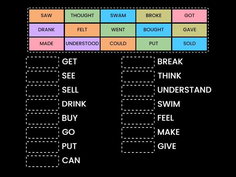 BROKE - BREAK, SOLD - SELL, MADE - MAKE, FELT - FEEL, PUT - PUT, UNDERSTOOD - UNDERSTAND, BOUGHT - BUY , THOUGHT - THINK , DRANK - DRINK, SWAM - SWIM, GOT - GET, GAVE - GIVE, WENT - GO, SAW - SEE, COULD - CAN,