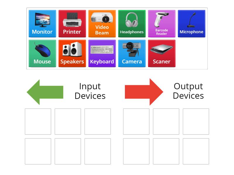 Input Devices: Microphone, Mouse, Camera, Barcode Reader, Keyboard, Scaner, Output Devices: Monitor, Video Beam, Printer, Speakers, Headphones,