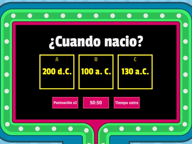 1) ¿Cuando nacio? a) 200 d.C. b) 100 a. C. c) 130 a.C. 2) ¿Que queria Julio césar? a) Conquistar roma b) hacer guerras c) Queria expandir el poder de Roma como lo hizo el macedonio con Grecia 3) ¿Quien lo secuestro? a) unos piratas b) Los del otro imperio c) Cleopatra d) Sus amigos 4) ¿Cuanto duro la dictadura de Julio césar? a) 20 años b) 5años c) 10 años d) 9 años 5) ¿Que construyo Julio césar? a) un imperio b) una casa c) el templo a venus Genetrix 6) ¿Donde mataron a julio césar? a) en su casa b) con su mujer c) en el interior de la cumbia del pompeyo 7) ¿Cuantos años tenia Julio césar al morir? a) 20 años b) 45 años c) 35 años d) 56 años 8) ¿Que ciudad fundo Julio césar? a) roma b) malaga c) Sevilla d) madrid¿ 9) ¿Quien era la novia de Julio césar? a) Ana b) Cleopatra c) Sofia d) Paula 10) En la guerra de julio césar y de pompeyo , ¿quien gano? a) Pompeyo b) nadie gano c) Julio césar d) No hubo guerra