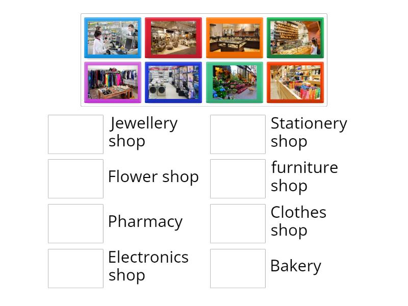 Flower shop, Jewellery shop, Stationery shop, Clothes shop, Pharmacy, Bakery, Electronics shop, furniture shop,