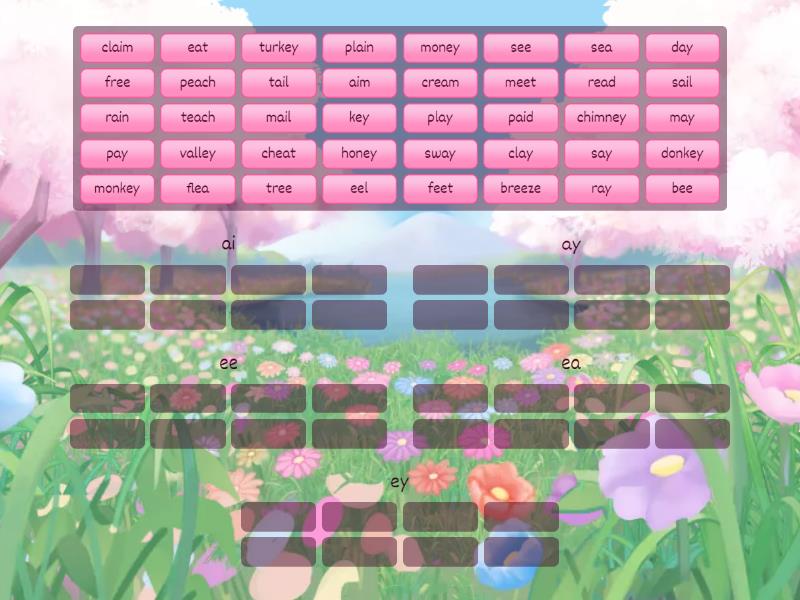 ai: aim, claim, paid, tail, sail, rain, plain, mail, ay: say, may, day, clay, sway, play, ray, pay, ee: feet, meet, bee, see, free, eel, breeze, tree, ea: read, sea, peach, cream, flea, teach, cheat, eat, ey: key, money, turkey, honey, monkey, donkey, valley, chimney,