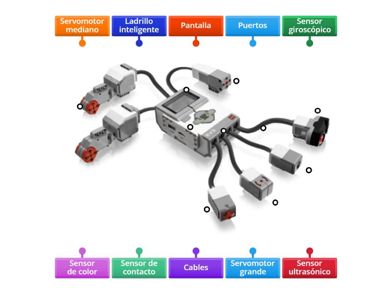 Servomotor grande, Sensor ultrasónico, Servomotor mediano, Sensor giroscópico, Sensor de color, Ladrillo inteligente, Sensor de contacto, Pantalla, Cables, Puertos.
