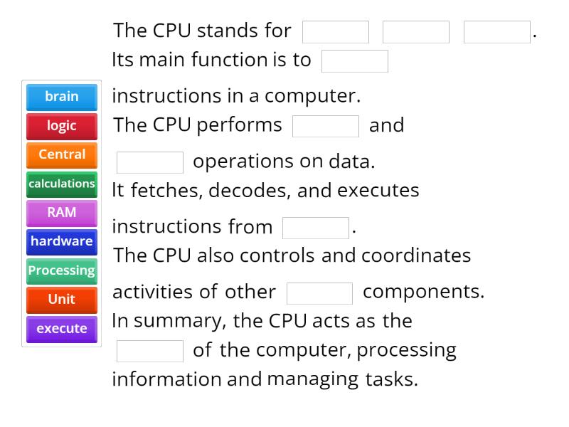 The CPU stands for ____ ____ ____. Its main function is to ____ instructions in a computer. The CPU performs ____ and ____ operations on data. It fetches, decodes, and executes instructions from ____. The CPU also controls and coordinates activities of other ____ components. In summary, the CPU acts as the ____ of the computer, processing information and managing tasks.