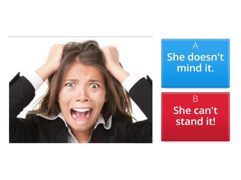 1) She loves cats. a) She doesn't mind cats. b) She is crazy about cats! 2) She hates her job! a) She loves work. b) She can't stand work. c) She is crazy about work! d) She likes work. 3) School is ok. a) They don't mind school. b) They hate school. c) They love school! d) They can't stand school! 4) She thinks math class is not bad. She doesn't think it is very good. a) She loves math! b) She doesn't mind math. c) She is crazy about math! d) She can't stand math! 5) Cats have a strong dislike for clothes. a) Cats hate clothing! b) Cats don't mind clothing. c) Cats are crazy about clothing. d) Cats like clothing.