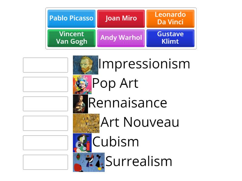 Joan Miro - Surrealism, Gustave Klimt - Art Nouveau, Andy Warhol - Pop Art, Pablo Picasso - Cubism, Vincent Van Gogh - Impressionism, Leonardo Da Vinci - Rennaisance,