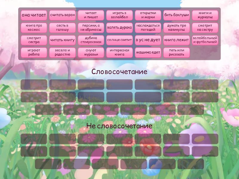 Словосочетание: смотрит на сестру, играть в волейбол, думать про каникулы, интересная книга, наслаждаться погодой, книга про космос, читать книгу, Не словосочетание: машина едет, книга лежит, солнце светит, играют ребята, она читает, смотрит сестра, снуют муравьи, открытки и марки, книги и журналы, волейбольный и футбольный, читает и пишет, персики, а не абрикосы, весело и радостно, петь или рисовать, бить баклуши, считать ворон, сесть в галошу, валять дурака, в ус не дует , дубина стоеросовая,