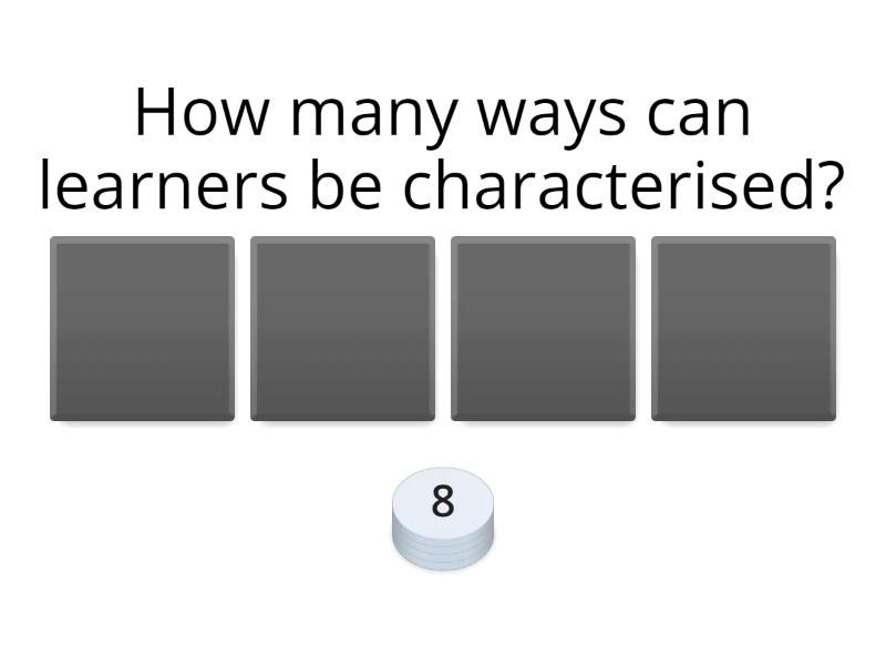 1) How many ways can learners be characterised? a) 2 b) 3 c) 4 d) 5 2) A Visual Learner learns best through............ a) Reading or Observing things b) Listening and Talking c) Handling Materials and Objects 3) A Auditory Learner learns best through............ a) Reading or Observing things b) Listening and Talking c) Handling Materials and Objects 4) A Kinaesthetic Learner learns best through............ a) Reading or Observing things b) Listening and Talking c) Handling Materials and Objects 5) What type of learner would prefer pictures and diagrams? a) Visual b) Audio c) Kinaesthetic 6) What type of learner would prefer instructions to be given orally? a) Visual b) Audio c) Kinaesthetic 7) What type of learner would prefer doing activities to learn? a) Visual b) Audio c) Kinaesthetic 8) How many Types of Guidance are there? a) 3 b) 4 c) 5 d) 6 9) Which Method of Guidance is best suited for the early stages of skill learning? a) Verbal b) Visual c) Manual 10) Which Method of Guidance is best suited for the more advanced learners? a) Verbal b) Visual c) Manual 11) Which Method of Guidance is best for Physical Supprt? a) Verbal b) Visual c) Manual 12) What are two types of Manual Guidance? a) Physical and Still b) Physical and Forced c) Non-Physical and Forced d) Forced and Bodily