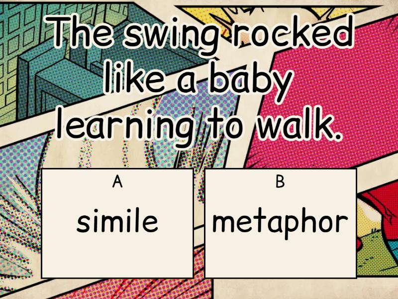 1) The swing rocked like a baby learning to walk. a) simile b) metaphor 2) My eyes are as dry as sand. a) simile b) metaphor 3) The city was as busy as a bee hive. a) metaphor b) simile 4) Mrs. Jalbert was a mama bear protecting her class. a) metaphor b) simile