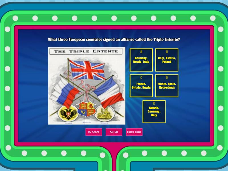 1) What three European countries signed an alliance called the Triple Entente? a) Germany, Russia, Italy b) Italy, Austria, Poland c) France, Britain, Russia d) France, Spain, Netherlands e) Austria, Germany, Italy 2) What is it called when a country expands its influence and power into a large empire? a) Despotism b) Communism c) Socialism d) Imperialism e) Absolutism 3) What single event triggered the start of World War I? a) The bombing of Pearl Harbor b) The assassination of Archduke Ferdinand c) Germany invaded Poland d) The alliance formed between Germany and Austria e) The death of the Tsar of Russia 4) Who was Archduke Ferdinand? a) The leader of Germany's armed forces b) The future Tsar of Russia c) The heir to the throne of Austria-Hungary d) The British ambassador to Germany e) The leader of the French government 5) What country declared war on Serbia at the very start of World War I? a) Germany b) Russia c) Italy d) France e) Austria-Hungary 6) Why do some historians believe that Germany wanted to start World War I? a) Germany felt that the war was going to happen b) Germany felt surrounded by enemies c) Germany felt that the sooner the war began, the better chance they had d) All of the above e) None of the above 7) Which of the following was a cause that contributed to the start of World War I? a) Imperialism b) Secret Alliances c) Politics d) National pride e) All of the above 8) World War I was mostly fought between the countries of what continent? a) Africa b) Asia c) Europe d) North America e) South America 9) What is trench warfare? a) Aerial combat b) Naval battles c) Land fighting in trenches d) Guerrilla tactics 10) What is a fire step? a) Sleeping area b) Cooking spot c) Raised step for firing d) Communication line 11) Purpose of sandbags in trenches? a) Decoration b) Protection from bullets c) Storage d) Sleeping 12) What is a dugout? a) A type of weapon b) A shelter in trench c) A trench tool d) A communication device 13) Common condition in trenches? a) Trench fever b) Sunburn c) Frostbite d) Heatstroke 14) What is a parapet? a) A trench wall b) A type of gun c) A soldier rank d) A food ration 15) What is 'No Man's Land'? a) A safe zone b) Area between trenches c) A soldier's camp d) A weapon storage 16) Role of barbed wire? a) Decoration b) Obstacle for enemy c) Communication d) Cooking