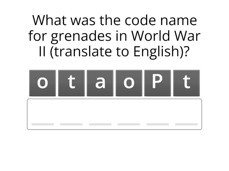 Potato - What was the code name for grenades in World War II (translate to English)?, Big Fish - Lo-Tso in Navajo means what?, Submarine - Besh-Lo or iron fish represented what?, Tsidi-moffa-ye-hi - What was the Navajo word for aircraft carrier?, Apple - Be-la-sana in Navajo means what?,