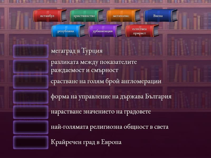 Виена - Крайречен град в Европа, мегаполис - срастване на голям брой англомерации, урбанизация - нарастване значението на градовете, християнство - най-голямата религиозна общност в света, естествен прираст - разликата между показателите раждаемост и смърност , истанбул - мегаград в Турция, република - форма на управление на държава България,