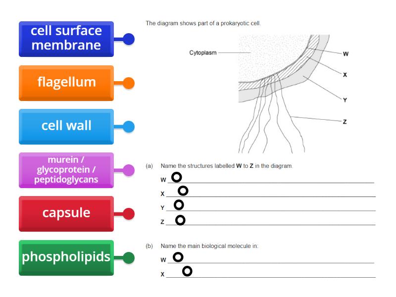 cell wall, capsule, flagellum, phospholipids, murein / glycoprotein / peptidoglycans, cell surface membrane.