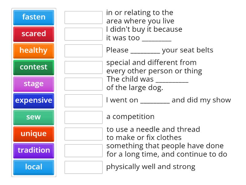 stage - I went on _________ and did my show, local - in or relating to the area where you live, unique - special and different from every other person or thing, tradition - something that people have done for a long time, and continue to do, sew - to use a needle and thread to make or fix clothes, contest - a competition, fasten - Please _________ your seat belts, scared - The child was __________ of the large dog., healthy - physically well and strong, expensive - I didn't buy it because it was too _________,