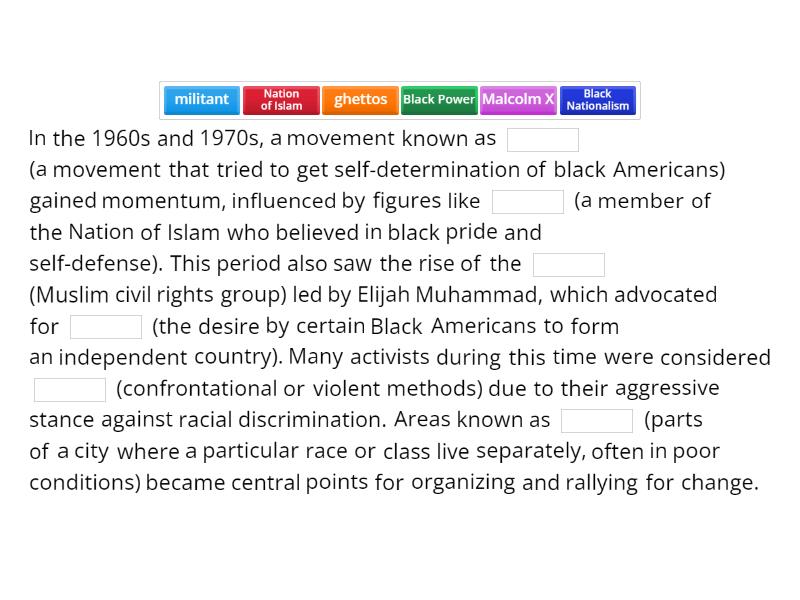 In the 1960s and 1970s, a movement known as ____ (a movement that tried to get self-determination of black Americans) gained momentum, influenced by figures like ____ (a member of the Nation of Islam who believed in black pride and self-defense). This period also saw the rise of the ____ (Muslim civil rights group) led by Elijah Muhammad, which advocated for ____ (the desire by certain Black Americans to form an independent country). Many activists during this time were considered ____ (confrontational or violent methods) due to their aggressive stance against racial discrimination. Areas known as ____ (parts of a city where a particular race or class live separately, often in poor conditions) became central points for organizing and rallying for change.