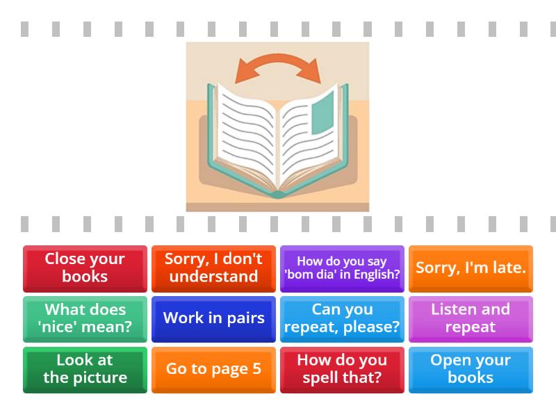 Open your books, Close your books, Go to page 5, Look at the picture, Listen and repeat, Work in pairs, What does 'nice' mean?, Sorry, I don't understand, How do you say 'bom dia' in English?, Can you repeat, please?, How do you spell that?, Sorry, I'm late.,