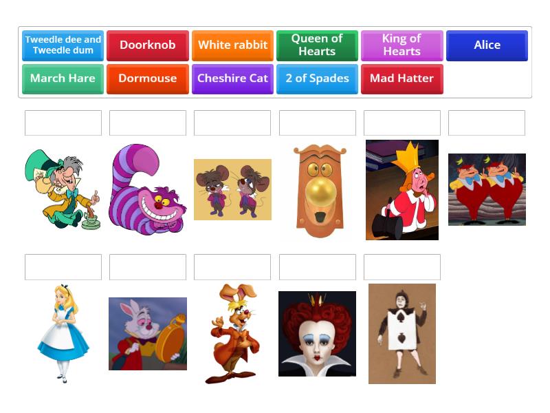 Alice , Queen of Hearts, Mad Hatter, White rabbit, Tweedle dee and Tweedle dum, Dormouse, Doorknob, 2 of Spades, King of Hearts , March Hare, Cheshire Cat,