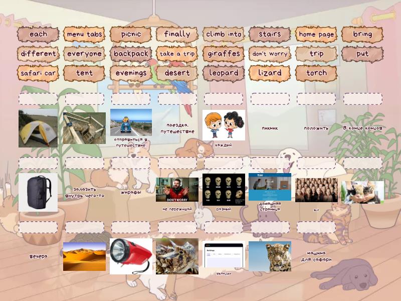 take a trip - отправиться в путешествие, desert, lizard, tent, bring, everyone - все, torch, backpack, stairs, menu tabs - вкладки, leopard, different - разный, home page - домашняя страница, each - каждый, don't worry - не переживай, trip - поездка, путешествие, safari car - машина для сафари, put - положить, picnic - пикник, giraffes - жирафы, evenings - вечера, finally - В конце концов, climb into - залазить внутрь чего-то,