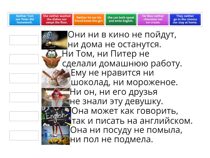 He likes neither chocolate nor ice-cream. - Ему не нравится ни шоколад, ни мороженое., Neither he nor his friend knew this girl. - Ни он, ни его друзья не знали эту девушку., Neither Tom nor Peter did homework. - Ни Том, ни Питер не сделали домашнюю работу., She neither washed the dishes nor swept the floor. - Она ни посуду не помыла, ни пол не подмела., They neither go to the cinema nor stay at home. - Они ни в кино не пойдут, ни дома не останутся., She can both speak and write English. - Она может как говорить, так и писать на английском.,