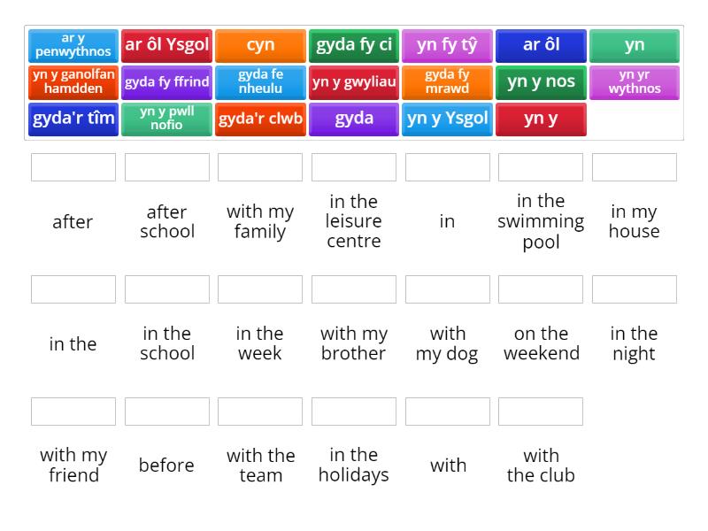 gyda - with, ar ôl - after, yn - in, cyn - before, yn y - in the, gyda fy mrawd - with my brother, ar y penwythnos - on the weekend, gyda fy ffrind - with my friend, yn y nos - in the night, yn y ganolfan hamdden - in the leisure centre , ar ôl Ysgol - after school, yn y Ysgol - in the school, gyda'r clwb - with the club, gyda'r tîm - with the team, yn y pwll nofio - in the swimming pool, gyda fe nheulu - with my family, yn y gwyliau - in the holidays, yn yr wythnos - in the week, yn fy tŷ - in my house, gyda fy ci - with my dog,