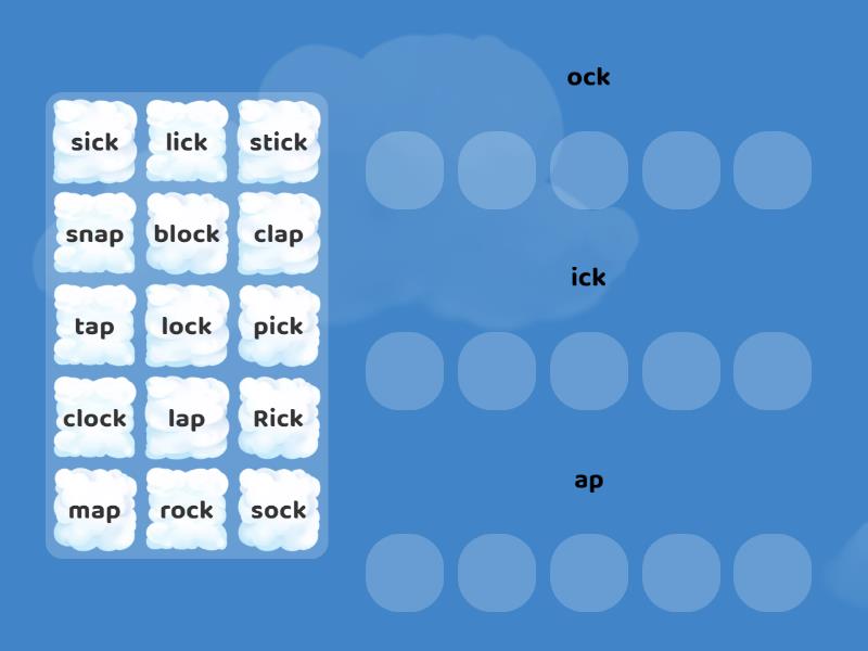 ock: sock, rock, lock, block, clock, ick: sick, pick, lick, stick, Rick, ap: tap, lap, map, snap, clap,
