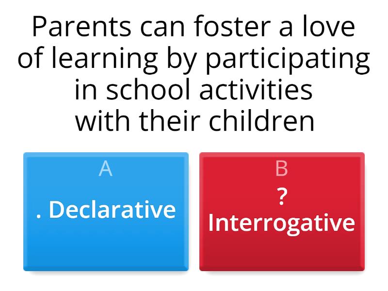 1) Parents can foster a love of learning by participating in school activities with their children a) . Declarative b) ? Interrogative 2) When will the event begin a) . Declarative b) ? Interrogative 3) My mom and dad will watch the Performance Show next week a) . Declarative b) ? Interrogative 4) She enjoys reading fiction books in her free time a) ? Interrogative b) . Declarative 5) What time does the program start a) ? Interrogative b) . Declarative