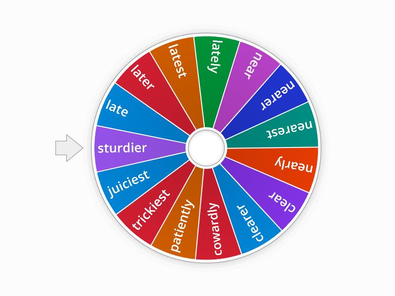 1) late 2) later 3) latest 4) lately 5) near 6) nearer 7) nearest 8) nearly 9) clear 10) clearer 11) cowardly 12) patiently 13) trickiest 14) juiciest 15) sturdier