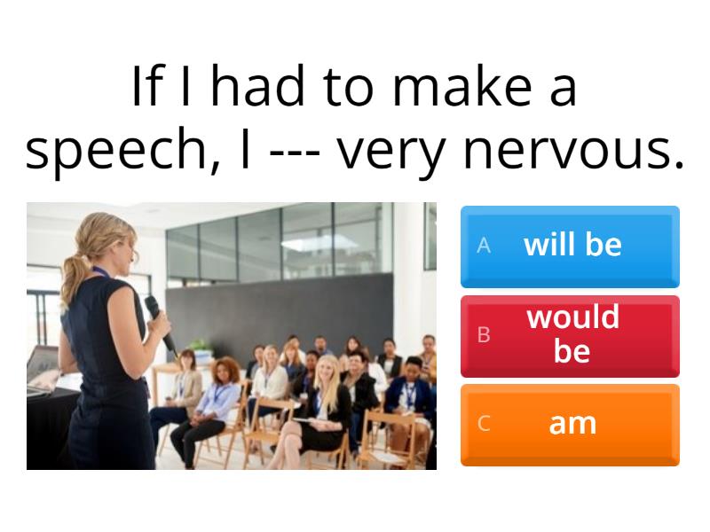 1) If I had to make a speech, I --- very nervous. a) will be b) would be c) am 2) If the weather --- fine tomorrow, we will go to the beach. a) is b) was c) would be 3) If you ask the policeman, he --- you the way to the station. a) would show b) showed c) will show 4) I --- you my scooter if you promised to be careful with it.  a) lend b) will lend c) would lend 5) If her hair was black, she --- completely different. a) will look b) would look c) looked 6) If the film is more than 3 hours long, I --- able to sit through it.  a) won't be b) wouldn't be c) is not 7) If it ---, the match will be cancelled. a) rains b) rained c) would rain 8) If he didn’t waste so much time, he --- to the university. a) goes b) will go c) would go 9) You would feel better if you --- so much junk food.  a) eat b) don't eat c) didn’t eat 10) If you --- things easy, you'll get ill. a) won't take b) don’t take c) wouldn't take