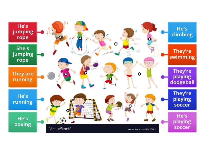 He's climbing, He's jumping rope, They are running, She's jumping rope, He's playing soccer, They're playing soccer, He's boxing, They're swimming, They're playing dodgeball, He's running.