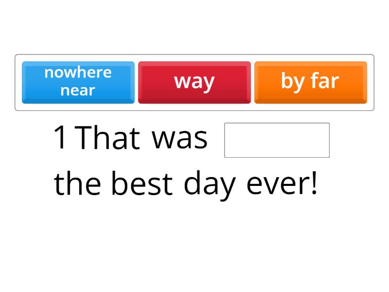 1 That was ____ the best day ever! 2 There were ____ more people at the event this year. 3 It was ____ as cold as I expected. 4 This game was twice ____ expensive in the shop as it was online. 5 There was ____ interest in the first option. Email is nowhere near as ____ as the ‘@’ symbol. The pyramids are twice as ____ any other building from that time. Stonehenge is by far ____ building in England. The pyramids in Mexico were just ____ the ones in Egypt. The Santa Maria de Loreto is a far ____ wooden structure than any other in existence.