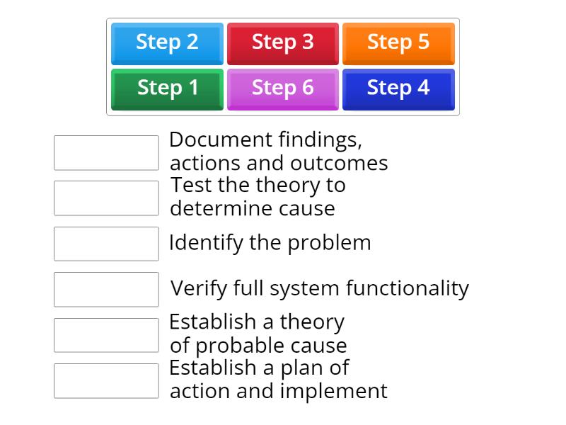 Step 1 - Identify the problem, Step 2 - Establish a theory of probable cause, Step 3 - Test the theory to determine cause, Step 4 - Establish a plan of action and implement, Step 5 - Verify full system functionality, Step 6 - Document findings, actions and outcomes,