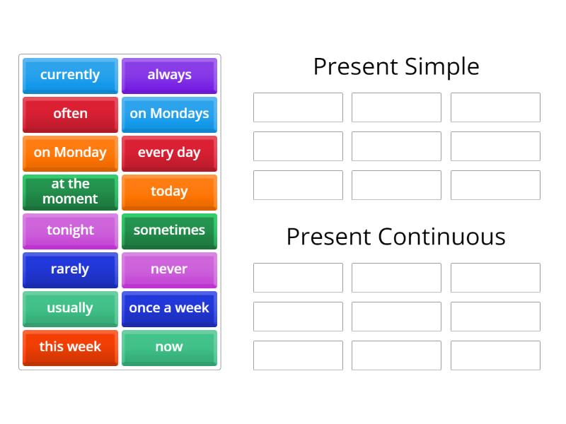 Present Simple: always, usually, often, sometimes, never, on Mondays, every day, once a week, rarely, Present Continuous: now, at the moment, currently, today, tonight, this week, on Monday,